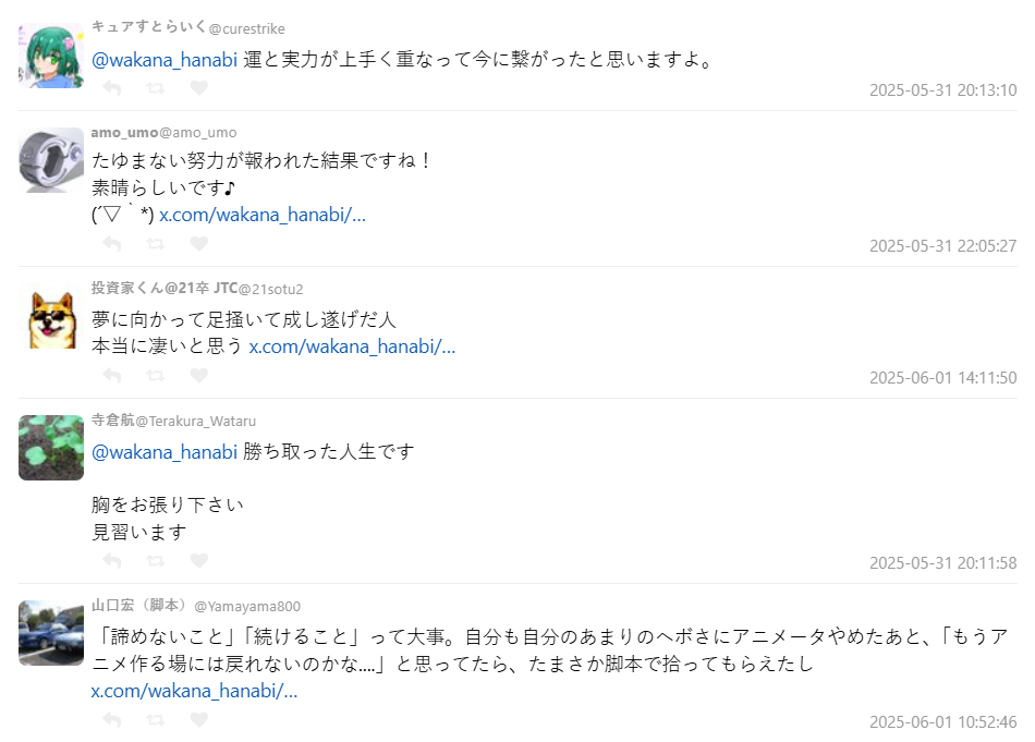 有人感性寫道:「你是真正為夢想奮鬥並成功的人,超強!」、「這是你努力贏來的人生,請好好挺胸接受大家的掌聲!」也有人從創作者角度出發,說:「『不放棄』跟『持續』真的很重要,我以前也以為自己沒機會回到業界,但後來靠寫腳本東山再起。」