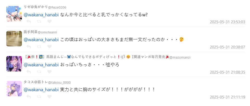 除了勵志留言,也有不少網友以輕鬆方式留言為他加油。有粉絲笑說:「跟現在比起來,角色的胸部也大了是不是?」、「以前連胸部都無一文的感覺」甚至還有人戲稱:「實力和胸部的成長是同步的!?」