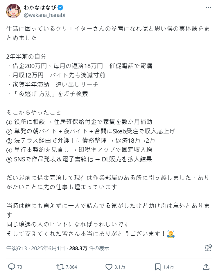 他也分享了兩年半前自己當時倉庫公司倒閉的發文,剛變成無業又身無分文的時候,覺得人生大概完蛋了,還認真上網查「夜逃怎麼辦」之類的東西。沒想到現在竟然能有這麼多人看我的作品…人生變化真的說不準耶。目前雖然還是很拚命,但好歹能靠創作維生了!
