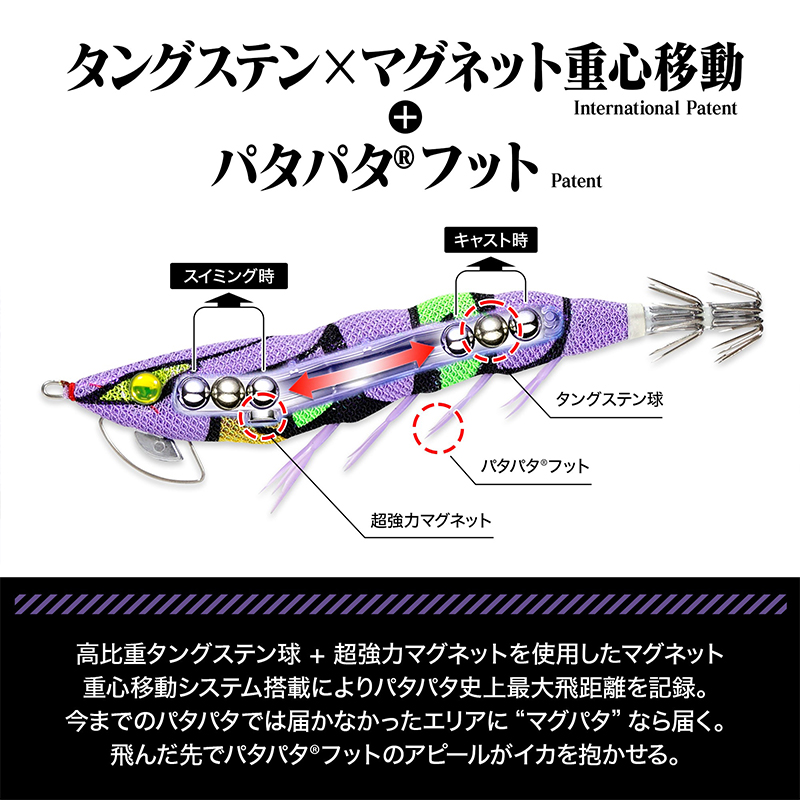 具有專利「パタパタ®」擺動尾鰭,就算水流很弱也能細微擺動,模擬真的小魚游動,讓你釣魚更好上手,且入水後自動回重心+固定設計,反應超迅速不拖泥帶水!