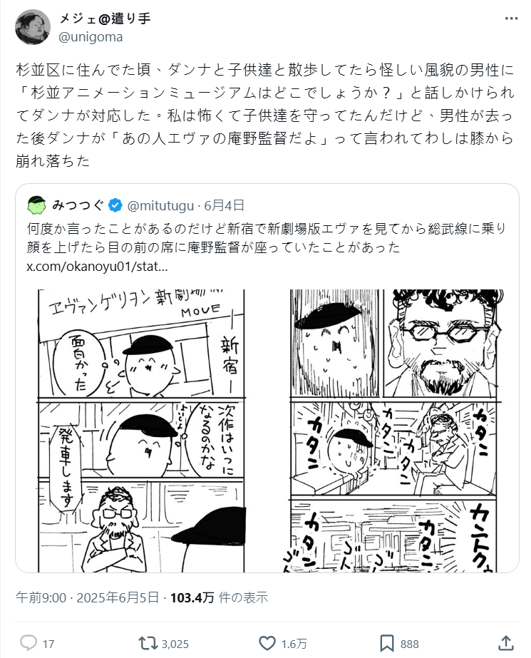 所以這位媽媽推主「メジェ」分享,當年她與先生和小孩一起在杉並區散步時,有位外貌神秘、身形高大、蓄著鬍子的男子突然上前詢問「請問杉並動畫博物館怎麼走?」她因對方看起來有點可疑,本能地把孩子護在身後。事後先生才淡淡地說:「剛剛那是庵野秀明導演。」讓她當場崩潰跪地。