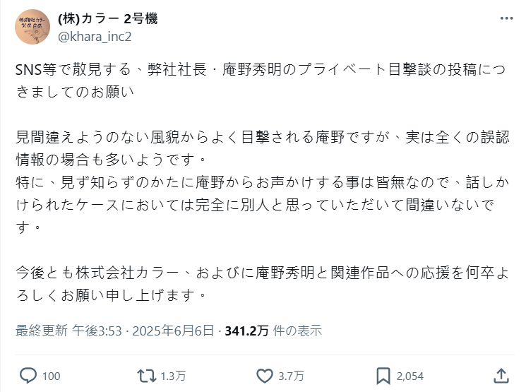 不過有趣的是,庵野所屬的動畫製作公司 khara 也跳出來發布聲明,表示雖然庵野導演外貌確實容易辨識,但社群上有許多「看錯人的誤報」,並強調庵野本人「幾乎不會主動搭話」,提醒粉絲「如果有人主動過來問路,那大概就不是他。」