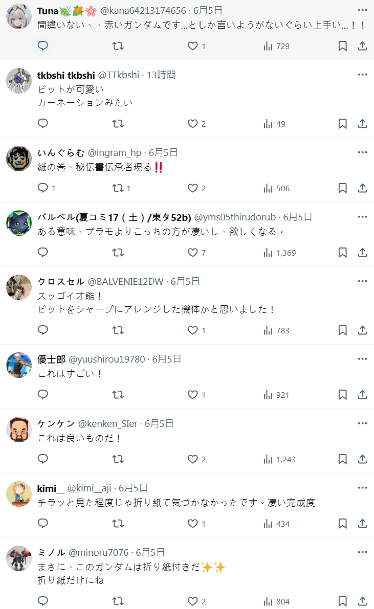 作品一曝光後,不少網友都湧入留言朝聖,紛紛讚嘆這精緻度根本可以比肩甚至不輸鋼普拉,紛紛表示:「黑橘點綴也完美還原!浮游砲超整齊,這份量根本贏鋼普拉了吧……」、「只看一眼根本不覺得是摺紙,完成度太神啦!」、「這纖細的比例超有EVA味,完全戳中我!」、「這完成度真的是職人水準!」