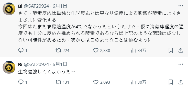 Bi 隨即展開自我挑戰,補充表示:「酵素反應不一定遵守單純的化學反應邏輯,酵素有自己的最佳溫度,要是冰箱溫度也能讓酵素運作的話,那我上面的推論就不成立了……所以下次還是謹慎一點才對。」