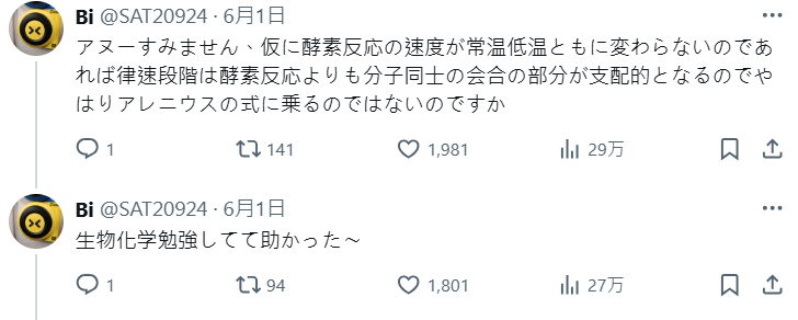 其後又補充::「如果酵素反應速度在冷熱溫度下差不多,那反應速率可能是由『分子碰撞頻率』主導,那樣又會回到阿瑞尼士方程式……」