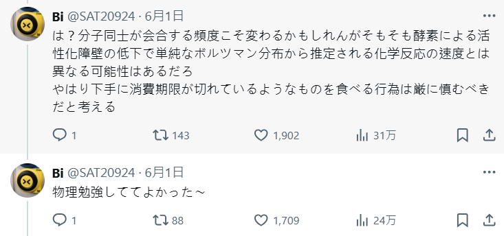 日本 X 日前出現一則超狂話題貼文,一名推主「Bi」發文自爆自己吃下了一個「消費期限超過17小時」的便當,但他沒有驚慌,而是用一連串嚴謹(?)的化學、生物、物理知識,試圖科學化推論這個便當「其實還沒過期」。這串又中二又認真的推文引發熱烈轉發,讓不少網友稱讚他的實驗精神。