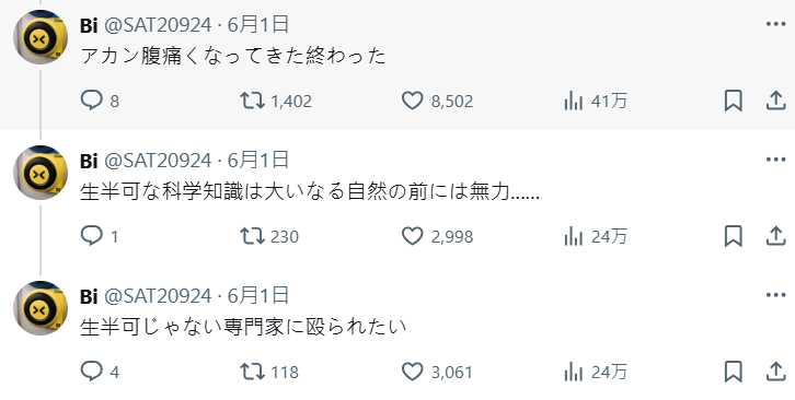 不到20分鐘,Bi 更新最新戰況:「啊不行,肚子開始痛了,完蛋。」最後他感嘆:「半吊子的科學知識根本無法戰勝大自然……我現在好想被專業人士揍一頓。」這波理科型精神勝利法,最終仍敵不過過期便當的威力阿...。