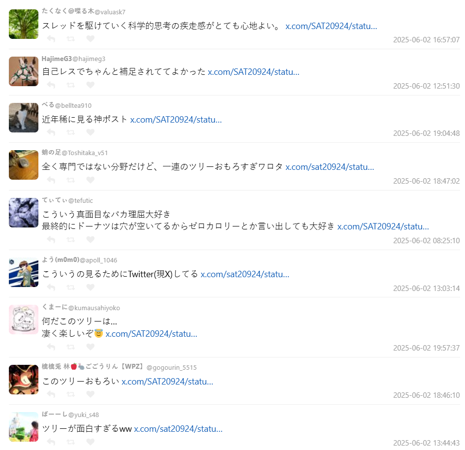 這串推文像連載一樣科學推進,最後自爆敗北的劇情讓不少網友笑翻:「這種認真分析的蠢理論我超愛」、「整串像衝浪一樣的理科腦思路,超順超爽」、「我就為了看這種東西才上X」、「講一輪科學,最後靠意志吃便當,這什麼超展開」。
