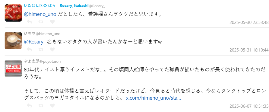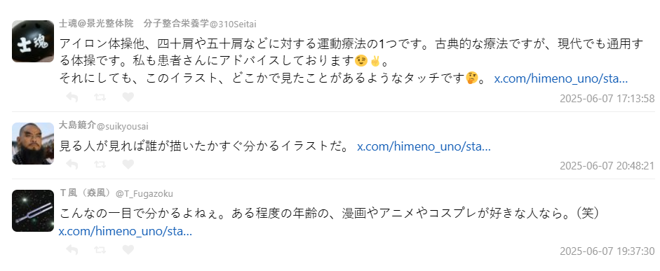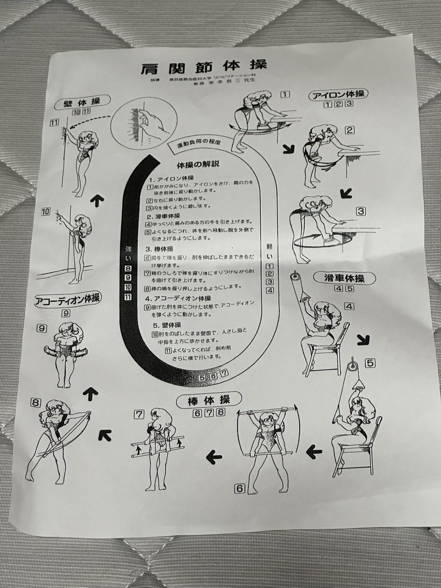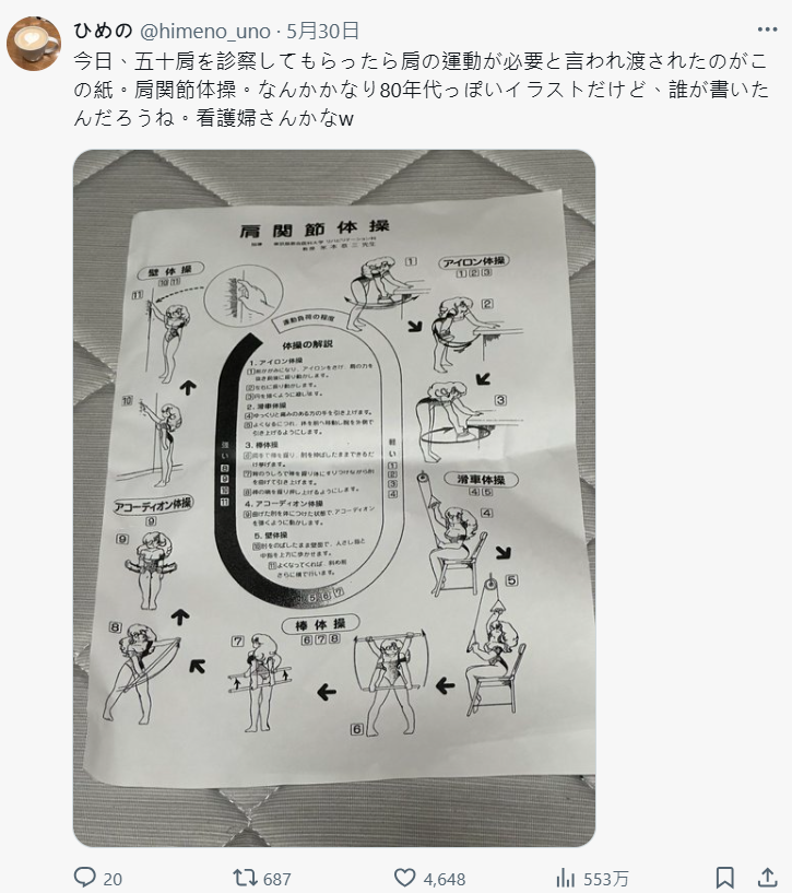 事件起於推主「ひめの」發文表示,自己因五十肩就醫,醫院給了一張肩關節體操的圖解表。不過她隨即被圖上的懷舊畫風吸引,笑說「這看起來好80年代,到底是誰畫的?是護士嗎www?」