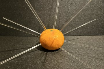 以橘子為範例,把裏頭的果肉全部挖空,把剛剛準備的壓克力棒一個個插上去。