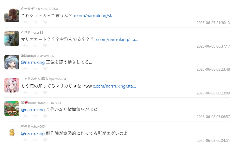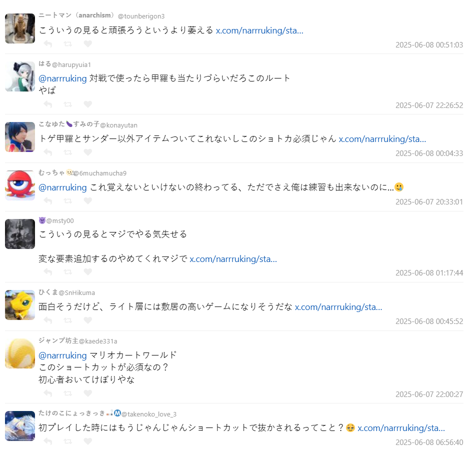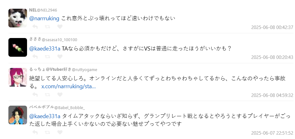 這樣的表現也引發抱怨,認為 : 「現在這些捷徑幾乎變成標配,普通路線根本贏不了」、「比的是誰記得更多花式操作,不是賽車技術」。還有人形容:「初次遊玩就會被這些神人捷徑輾過,真的會玩到想哭。」