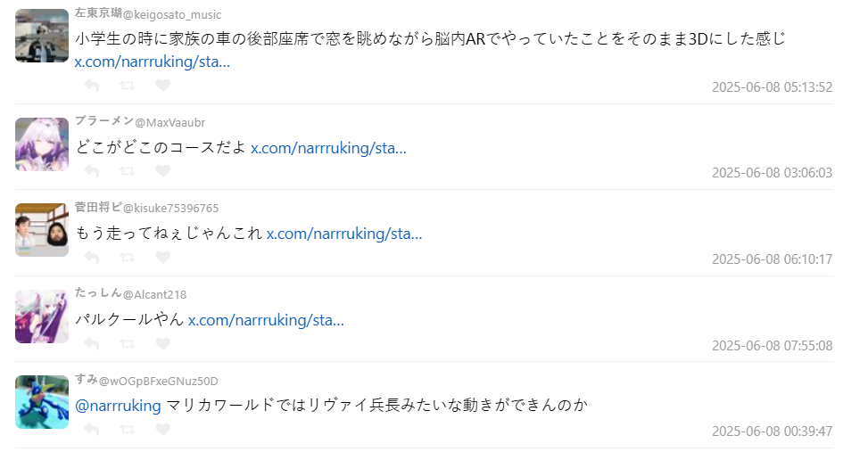 有玩家形容:「就像小時候坐在後座看窗外、腦中幻想的3D賽車遊戲變成現實。」、「這動作已經讓我覺得這是《進擊的巨人》里維兵長在操作立體機動裝置了。」