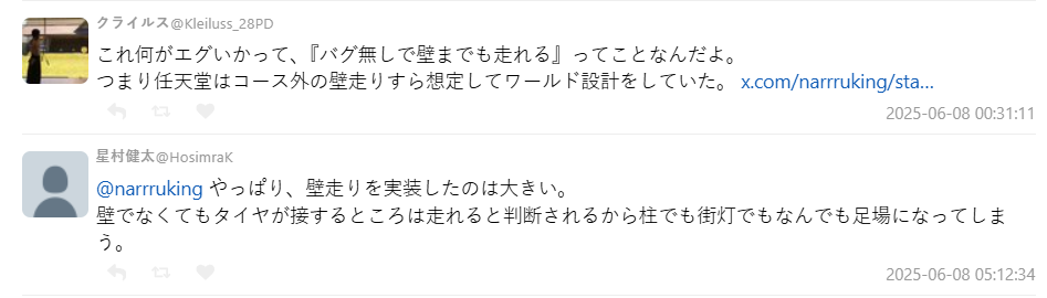 更有玩家指出:「厲害的是,這些操作完全不是利用 bug,而是遊戲本來就允許你跑牆壁。開發團隊根本有預設這些。」,也有人表示,現在這個設計,看起來根本不需要賽道了,只要有本事就可以飛天遁地完成比賽,