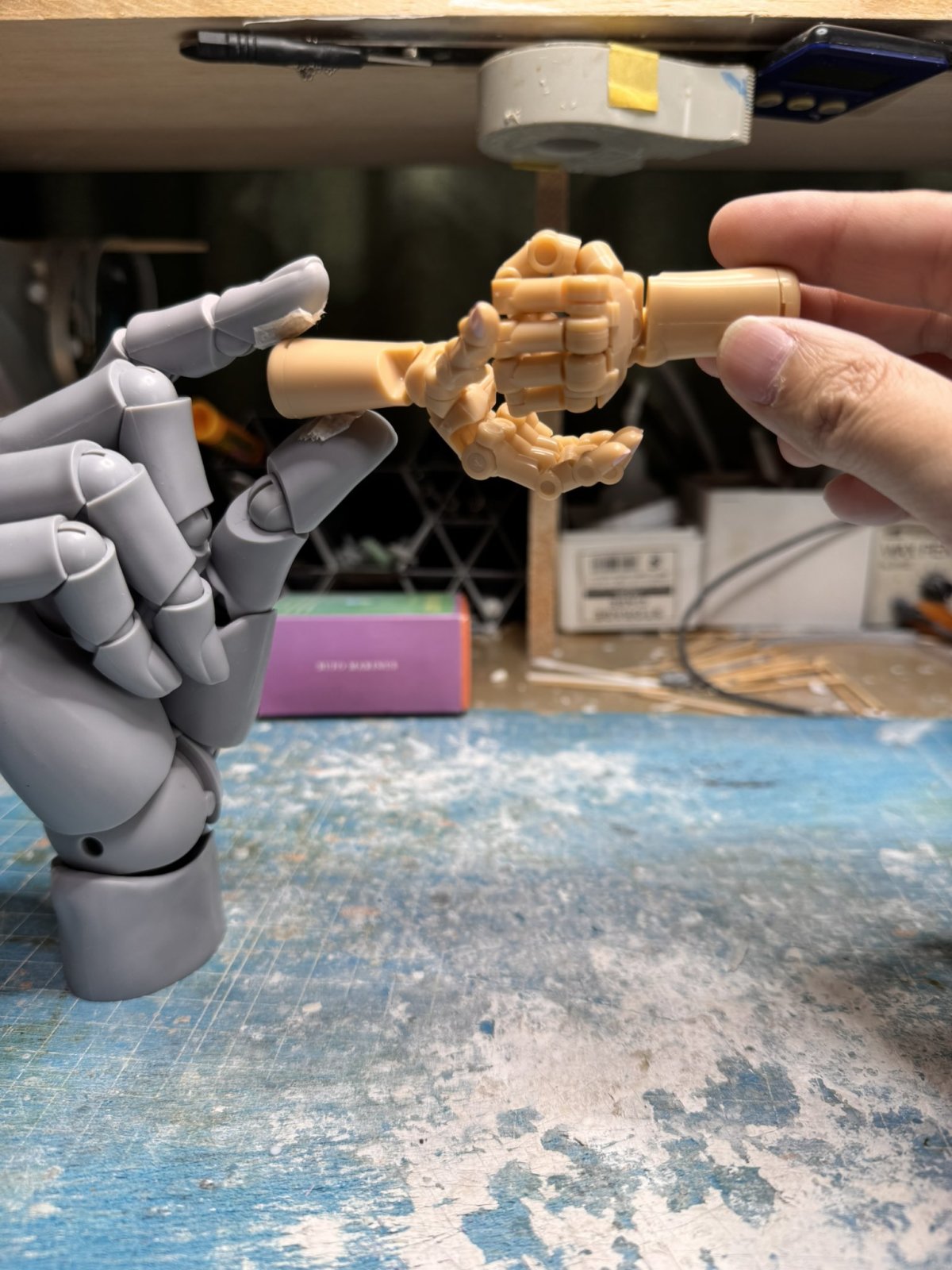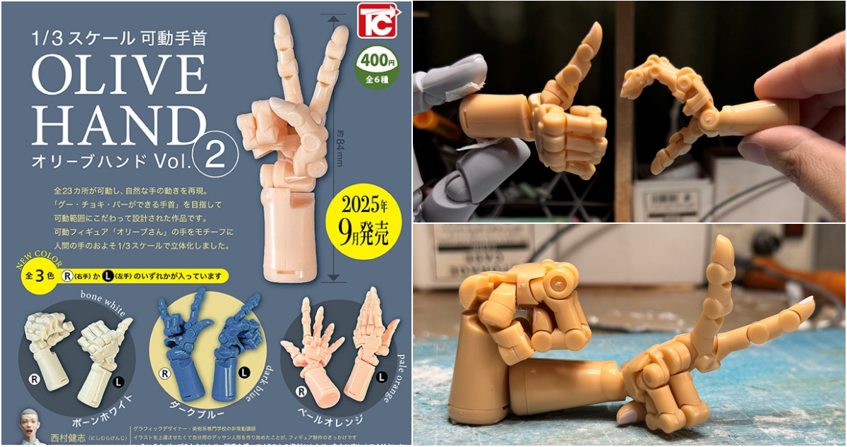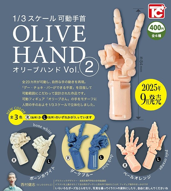 TOYS CABIN「1/3 比例 可動手腕 OLIVE HAND Vol.2」,第二彈收錄有:骨白色、暗藍色、淡橙色三種顏色,並且各有左手與右手共六種款式。採用 1/3 的比例將西村健志 OLIVE-san 可動人偶的手部轉蛋化,在僅約 8.4 公分的小尺寸中,設計有 23 處可動關節,能夠精巧地比出各種手勢,包含困難度極高的剪刀、比讚等,很適合作為插畫的參考~