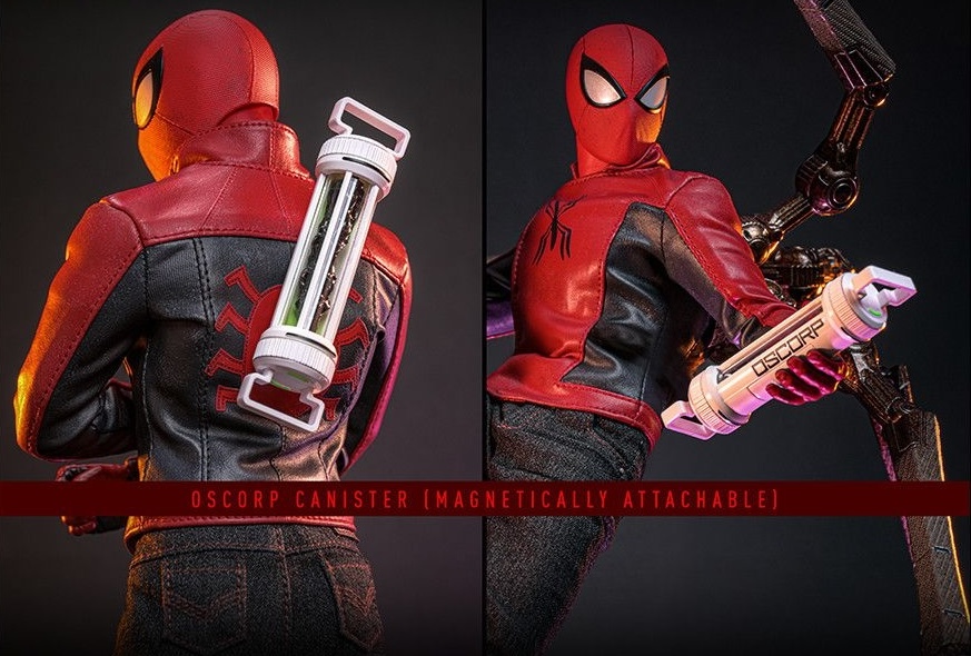 本次的彼得·帕克背水一戰戰衣1/6比例收藏級可動人偶高約30公分,採用了全新開發的蒙面頭雕,以複合布料材質剪裁還原紅黑色皮革質感的夾克,牛仔褲與靴子造型也都忠實再現遊戲中的設計!配件收錄多組替換手、替換鏡片、多組蛛網特效、裝有共生體的奧氏企業容器、夥伴的戰鬥無人機、能夠以磁吸功能吸附於人偶背部的可動機械臂等,可以搭配全身30處的可動關節寫實再現遊戲中的姿態!