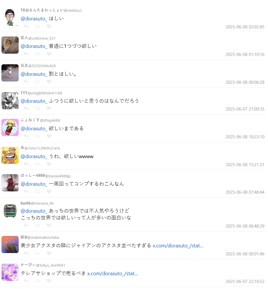 此外,也有許多網友表示「真的會想買」,甚至有人喊出「想收集全套」、「美少女立牌旁邊就是要擺胖虎才有反差萌」,還有人建議官方應該直接在朝日電視台的網路商店上架販售,趕快商品化阿 !