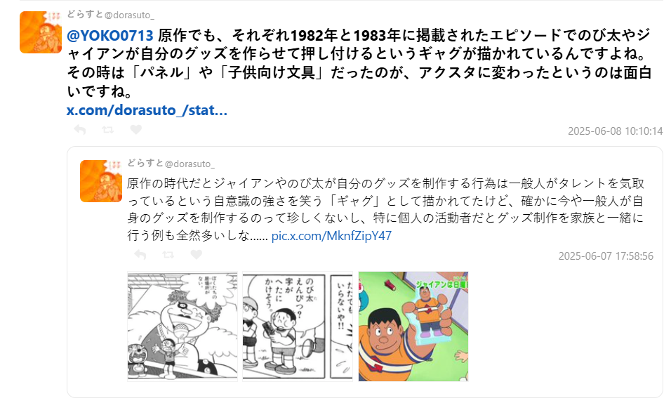 不僅如此,也有網友指出,這一幕其實與原作精神相呼應。「原作在1982與1983年就出現過胖虎或大雄製作自己周邊並強迫別人購買的情節,只是以前是像墊板或文具,現在變成壓克力立牌這種比較現代的形式。以前會覺得那是在搞笑角色自戀,但現在這種自產自銷反而變成常態了,尤其自媒體或創作者還會跟家人一起做。」