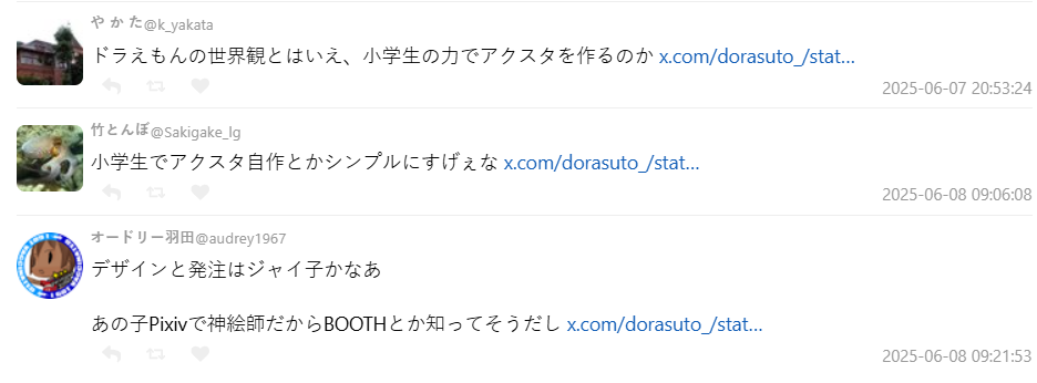 更有網友開玩笑說,胖虎一個小學生都知道要賣「壓克力立牌」,根本是商人等級。網友還猜測是胖虎的妹妹小珠(ジャイ子)繪圖設計的,並笑稱「她在Pixiv搞不好是神繪師,還會用 Booth 賣周邊」。