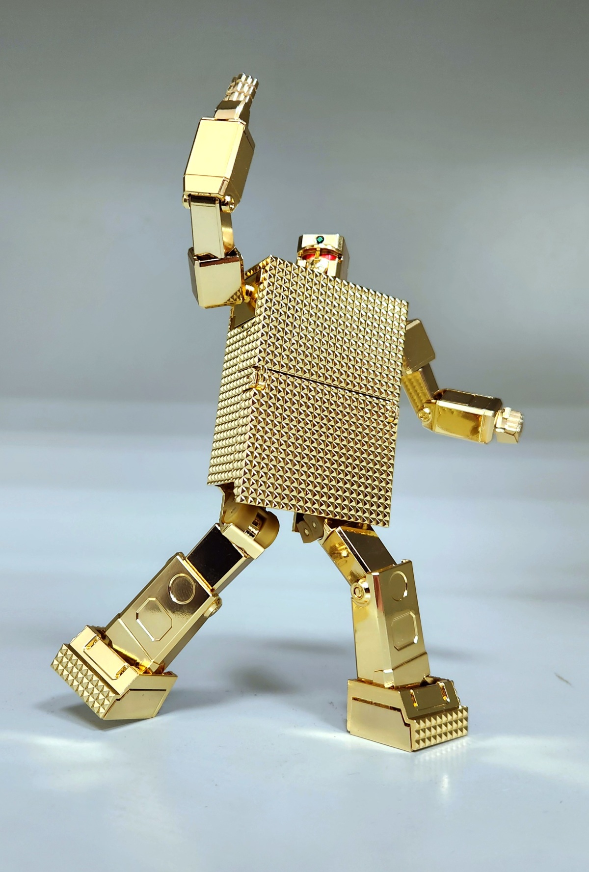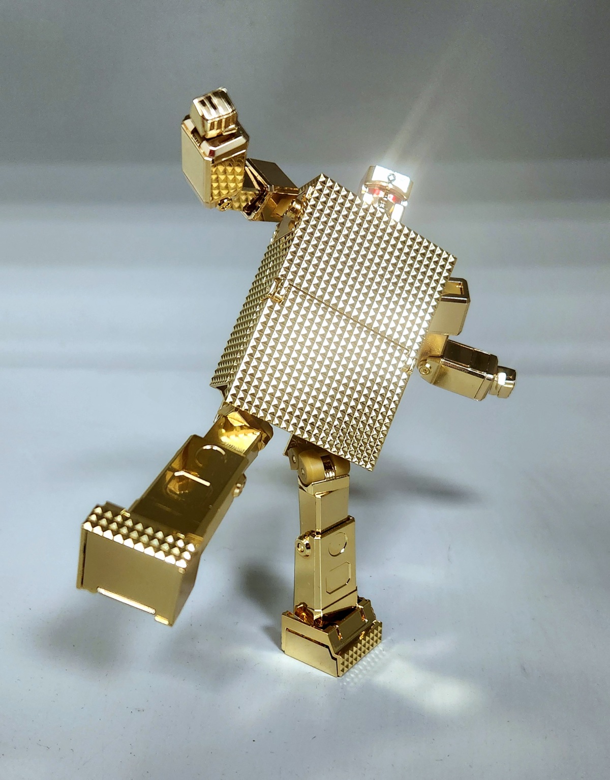 本体的金色非常奪目,但普遍任何電鍍產品比較容易發現瑕疵,相信這只亦是避免不了。可動性就可變而言已經盡力。而變形過程簡單,當中你可以發現一些小機構上下了不少心思及苦功,令黃金俠手腳的比例及長度盡量拉長。而打火機形態...... 今次真的是一個打火機了,接近完美!