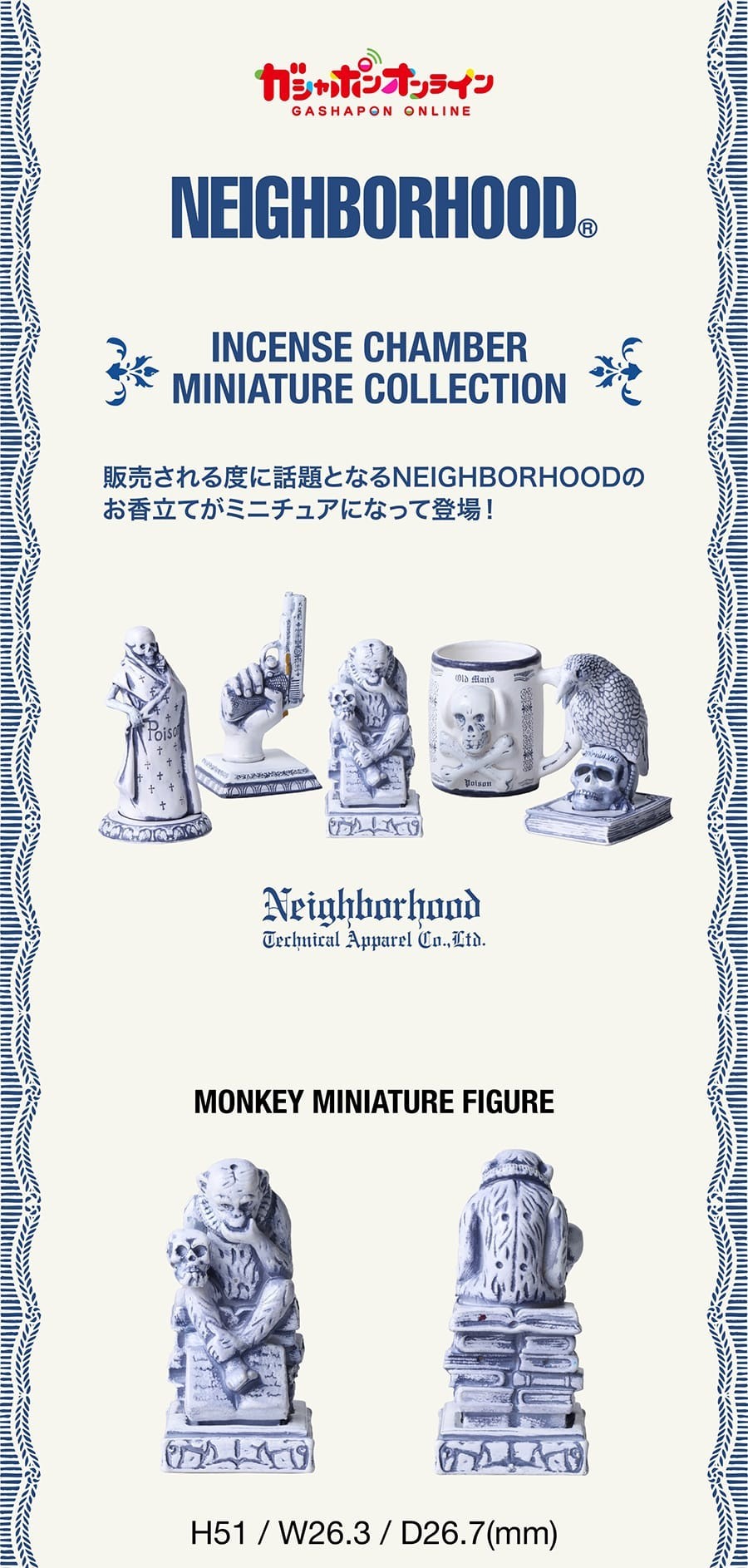 「NEIGHBORHOOD INCENSE CHAMBER MINIATURE COLLECTION」轉蛋,將 NEIGHBORHOOD 人氣卻難入手的線香座收藏品以約 4 公分的轉蛋尺寸再現,讓玩具人能以平價收藏~收錄有:MONKEY、REAPER、CROW、CLT與MUG 五種款式。凝聚原作精髓,將 NEIGHBORHOOD 的工藝精神注入其中,即使是迷你尺寸也講究塗裝與細節刻劃,表現出極佳的質感。雖不能實際作為線香座使用,但也是非常出色的小小裝飾逸品!