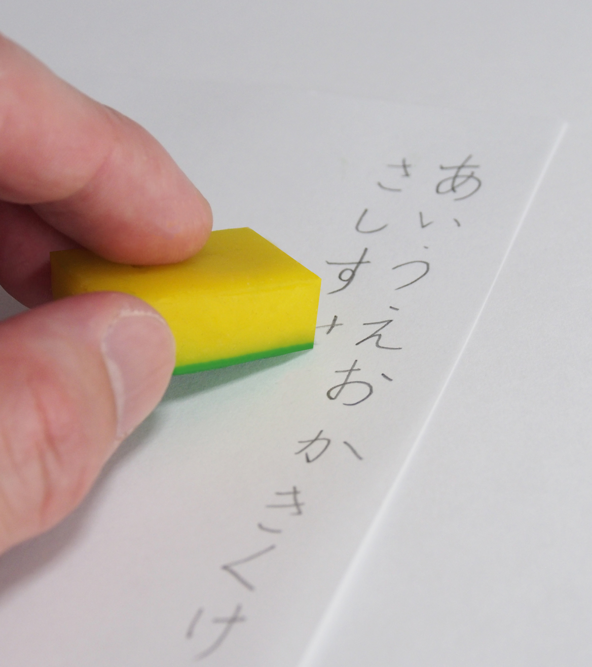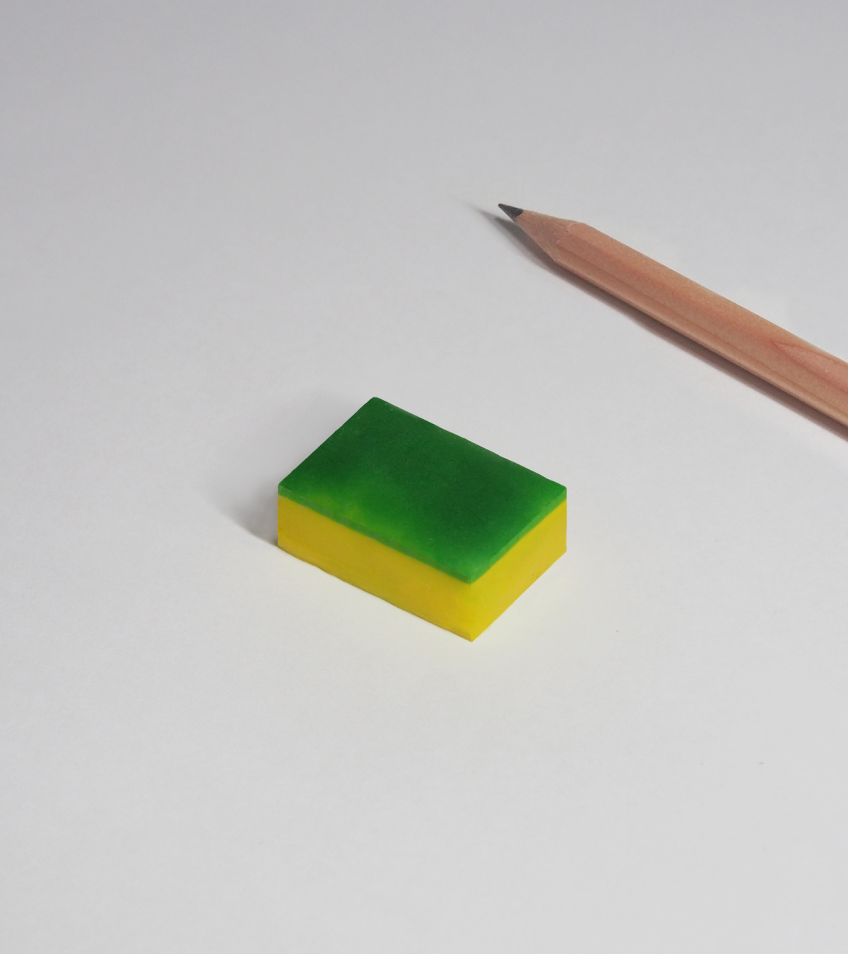 從圖片中可以看到,這款橡皮擦的外觀採用海綿與磨擦層雙層設計,以黃色部分吸水材質外觀,以及綠色的粗糙表面,來模擬廚房用海綿的真實質感。許多網友表示,實際使用時的確有一種「在清理文字」的錯覺,甚至讓人擦得上癮。