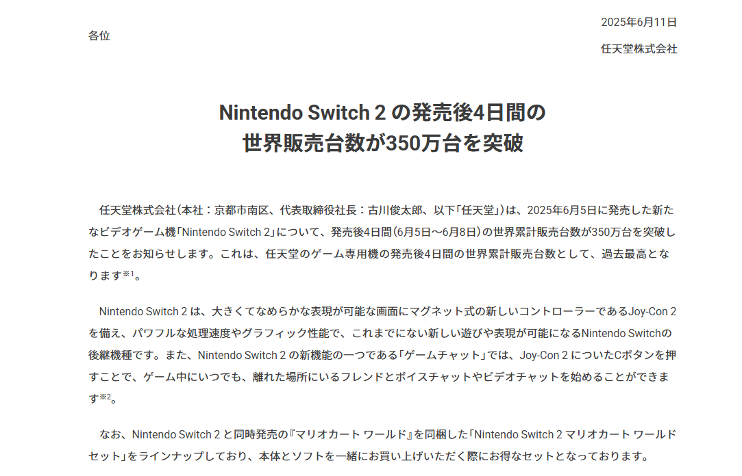 發售將近一週的次世代主機 Nintendo Switch 2,銷售表現備受關注。任天堂今日終於透過社群平台 X(前 Twitter)宣布,節自 2025 年 6 月 9 日,在全球首四天的銷售量已突破350萬台,刷新了公司硬體產品的最快銷售紀錄。這一佳績不僅超越了任天堂歷來所有主機的首發銷售數字,也充分展現了玩家對這款升級版新品的熱烈期待與高度支持。