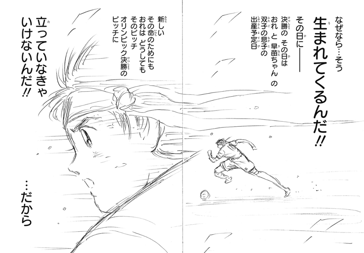在賽場他也吐露真心:「因為……對,就在這一天!決賽這天,正是我跟早苗的雙胞胎兒子的預產期。為了他們的誕生,我一定要站上那片球場——奧運決賽的球場!!」