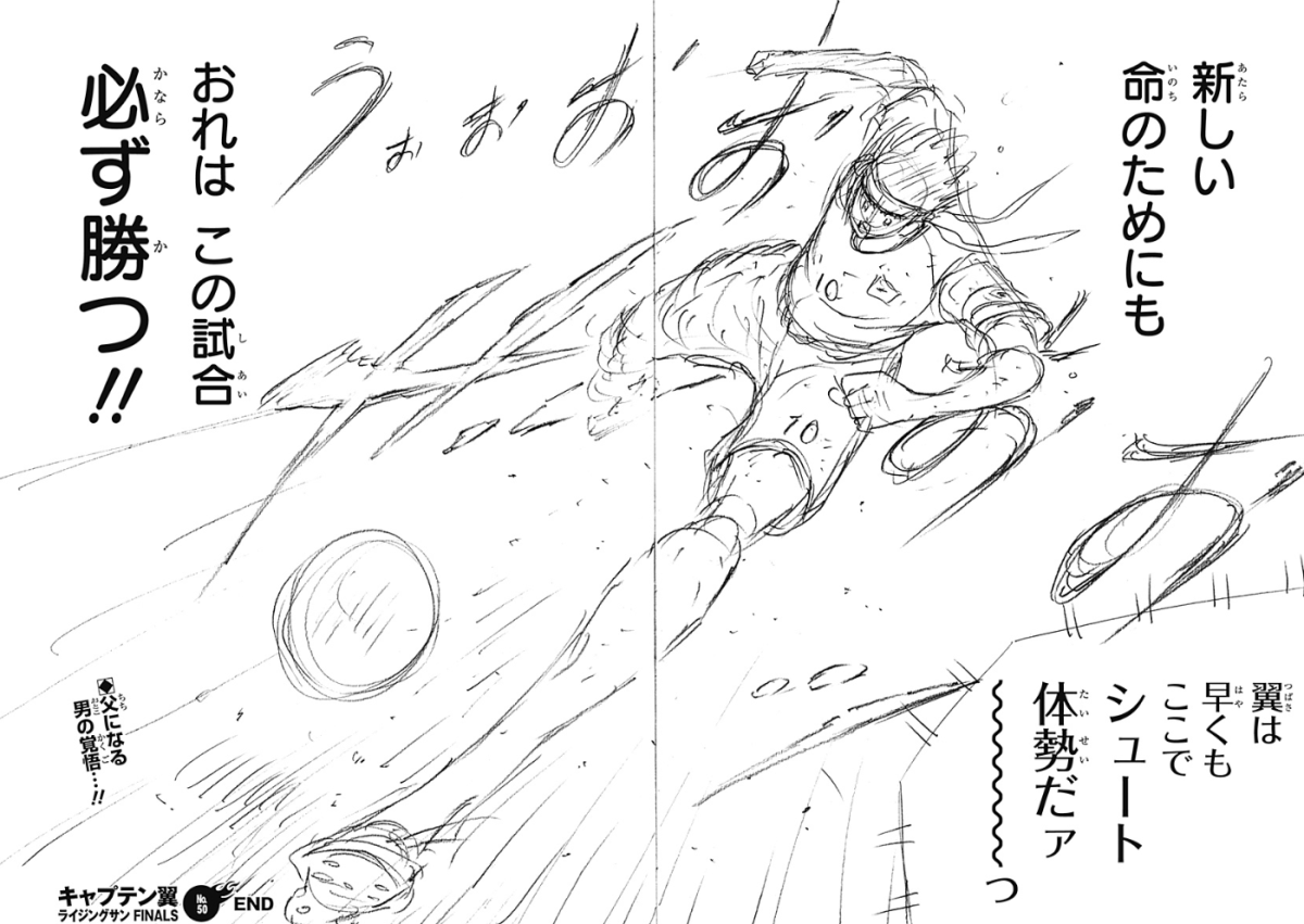 畫面最後定格在他起腳射門那瞬間,喊出:「為了新的生命,我一定要贏下這場比賽!」那一刻的翼,徹底展現出一位準爸爸的決心與覺悟。