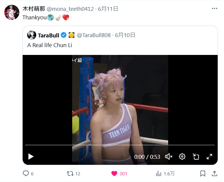 海外網友分享的這段影片,其實是 2025 年 1 月 26 日,木村在 Krush.170 比賽中對陣 Yuka☆的畫面,這場比賽她施展強大的腿技壓制對手,加上髮型的模樣,也讓網友讚嘆她根本是「真人版春麗」,這則影片也在短短兩天內獲得超過 16 萬的讚數。