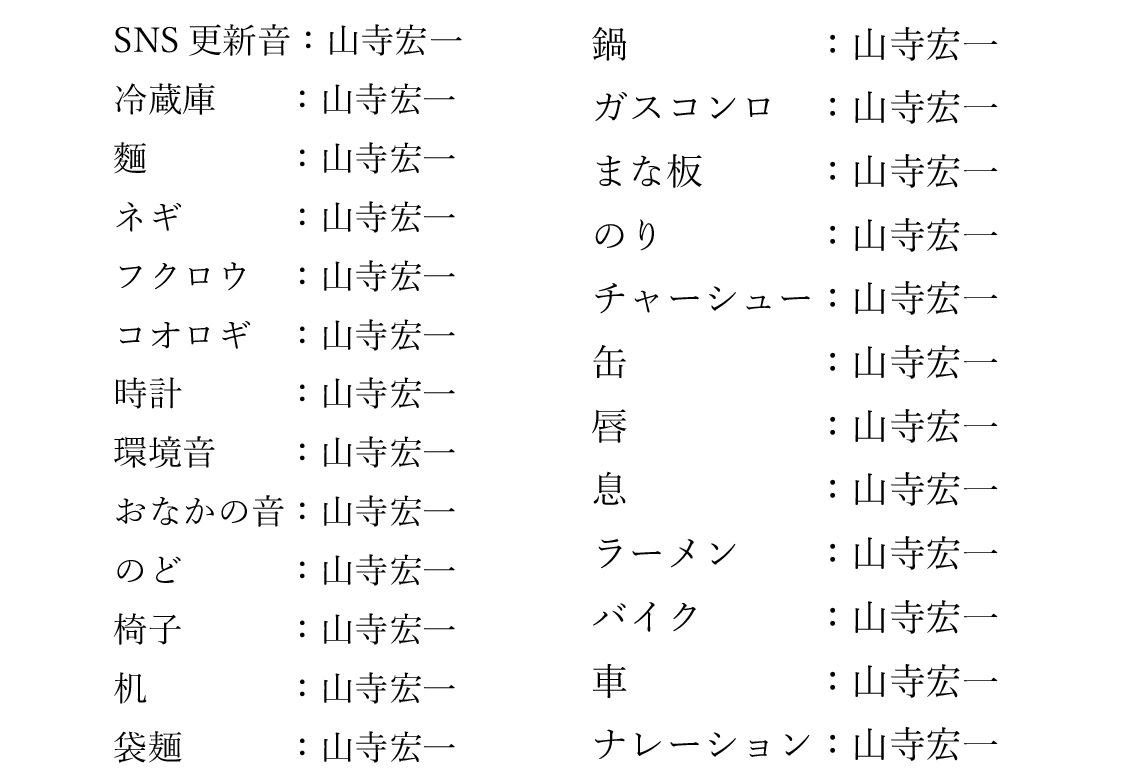 這次山寺宏一不是配角色的台詞,而是純粹配音效。像是手機社群軟體更新的提示音、打開冰箱的聲音、瓦斯爐開火的聲音、拆麵袋的聲音…通通是他自己用聲音模仿出來的!他在配音現場邊笑邊說:「這真的做得到嗎?(笑)」但其實在錄音前他早就私下狂練,還在自己家裡一直開關冰箱、研究聲音的細節。製作團隊也大讚:「根本完美重現!」