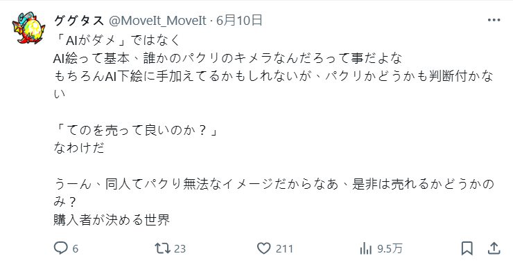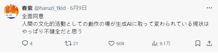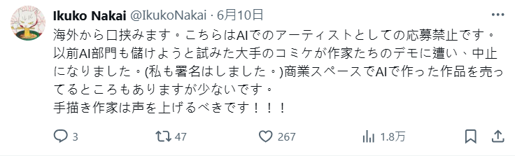 也有住在米蘭的日本網友指出,這邊是明文禁止用AI身分參加藝術展的。之前有個大型的同人展本來還想搞個「AI專區」來賺錢,結果被一堆創作者抗議抗到爆,後來整個企劃被取消了。當然還是有少部分商業攤會賣AI生成的作品啦,但真的很少見,認為手繪創作者真的該站出來發聲。