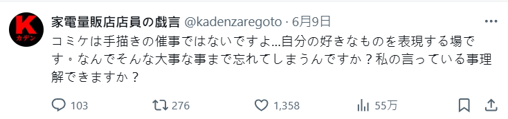 不過也有網友表示,Comiket 從來就不是一個手繪專屬的同人活動,而是表現自己愛好的地方,認為把這種事情跟 AI 混為一談並不合理,並沒有所謂「為何用AI繪圖還能報 Comiket 攤位」的問替。