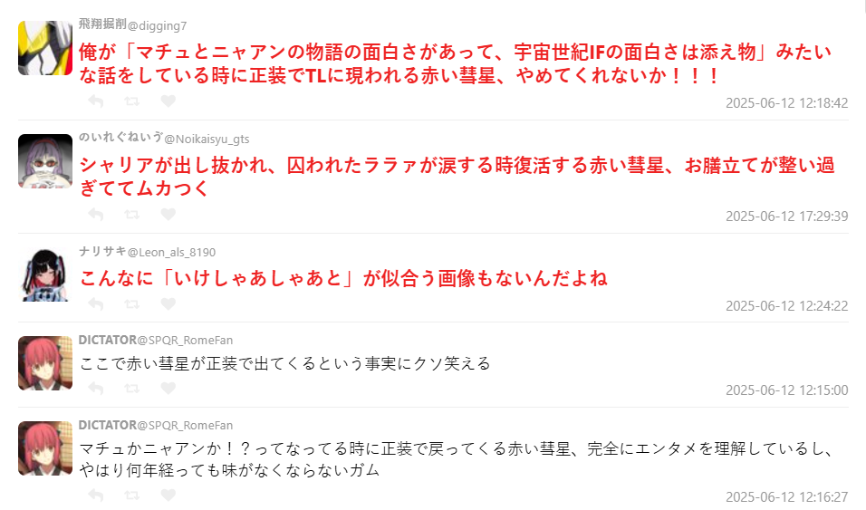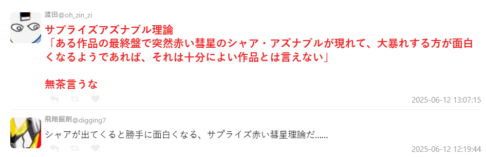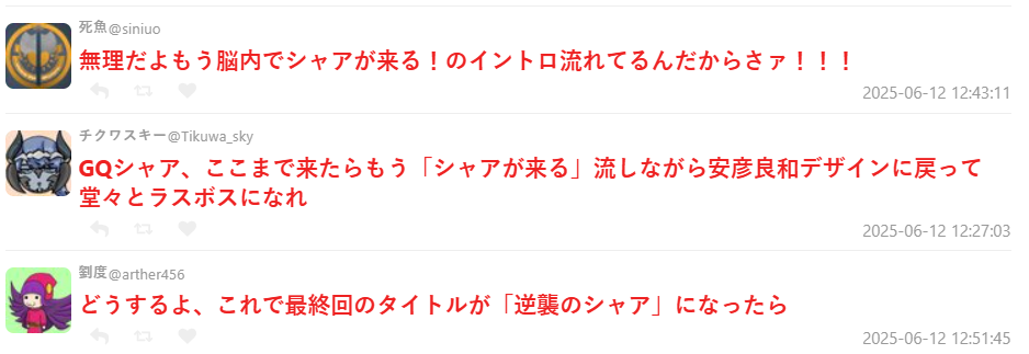 也有網友表示,如果下週播出夏亞登場,招牌經典出場曲「シャアが来る」播出來感覺都不太意外了,腦海中已經不斷迴響這首歌了...。甚至如果最終回標題真的變成《逆襲的夏亞》,好像也可以了 ( ? ) 。