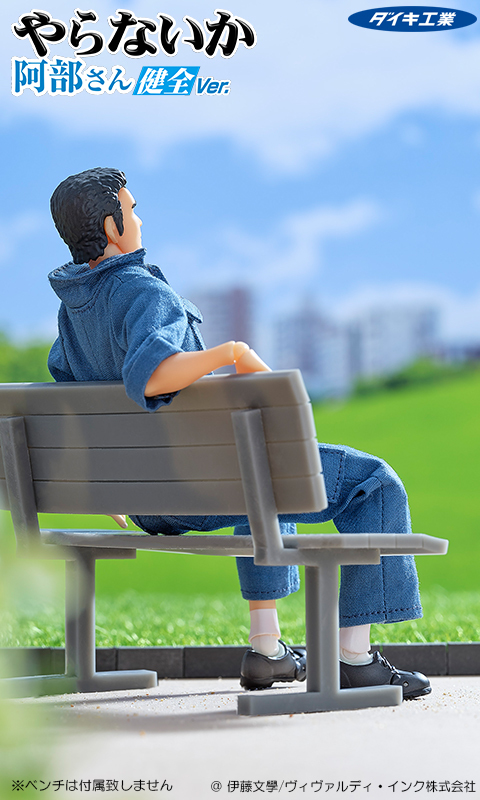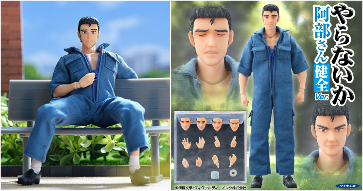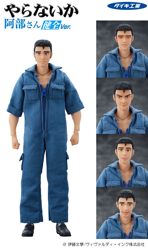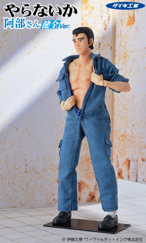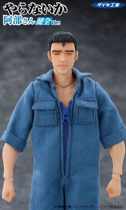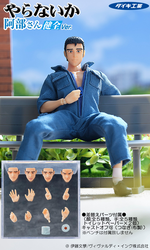 「不做嗎?阿部高和 健全ver.」1/12比例可動人偶,尺寸約高 16 公分,採用布製還原經典的藍色工作服,並使用拉鍊設計,可以脫下或重現拉鍊拉到底、露出OO的模樣,精壯的肌肉與O頭的色澤等細節都仔細刻劃~不過在健全版本中沒有附屬雙腿間的重要配件(不健全版則附有四根,有興趣的玩具人可移駕至大金工業官網觀賞)。另外,除了好男人臉之外,還有有四款替換表情零件,搭配豐富的手勢零件與兩個捲筒衛生紙,可以再現劇中令人過目難忘的場面~盡情賞玩傳奇梗圖!