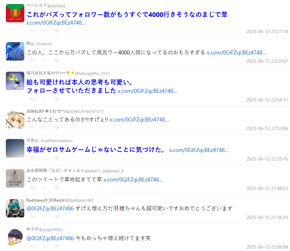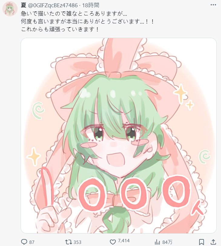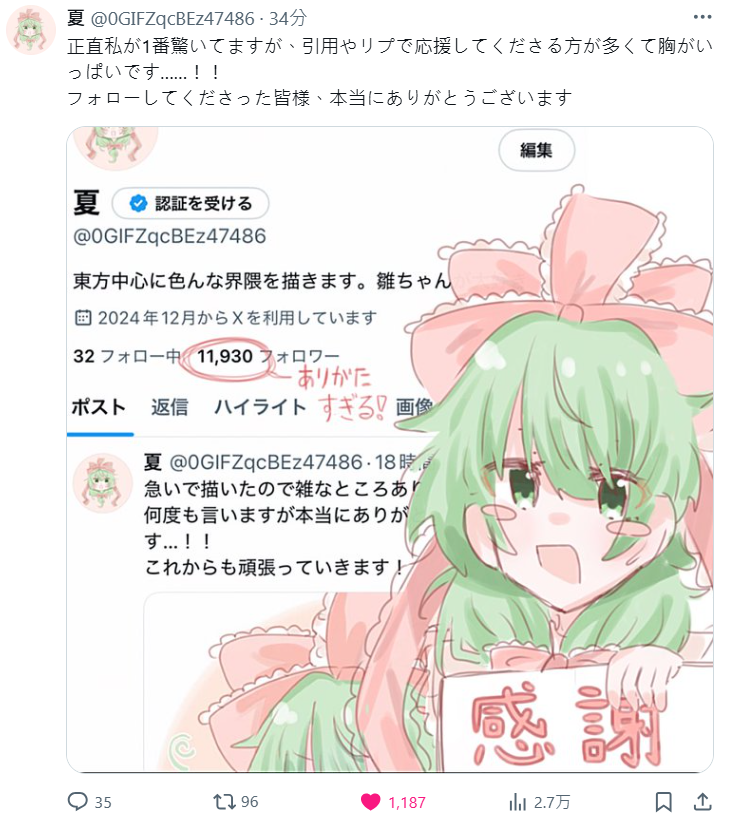 日本 X 出現一起令人會心一笑的社群奇蹟事件,一位以《東方Project》為創作的繪師「夏」(@0GIFZqcBEz47486),6 月 12 日下午發文感謝追蹤人數突破 10 人,沒想到這則看似平凡又樸實的貼文竟意外「中獎」,引發大量轉推與回覆,從幾百到幾千,截至今日中午 ( 6/13 ) 已經突破一萬,讓網民都為之驚艷。