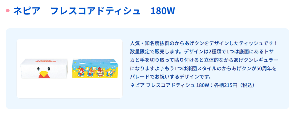 除了T恤之外,還有跟無印良品聯名的毛巾手帕、原子筆,甚至還跟nepia合作,推出印有炸雞君(からあげクン)圖案的面紙盒,整個就是走一個「我就愛Lawson」的路線。