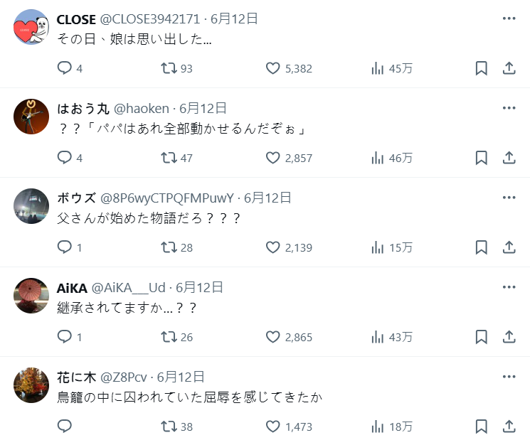 還有人配「那一天,女兒想起了什麼」、「從父親開始的故事」,當然少不了的就是「繼承」了 XD。