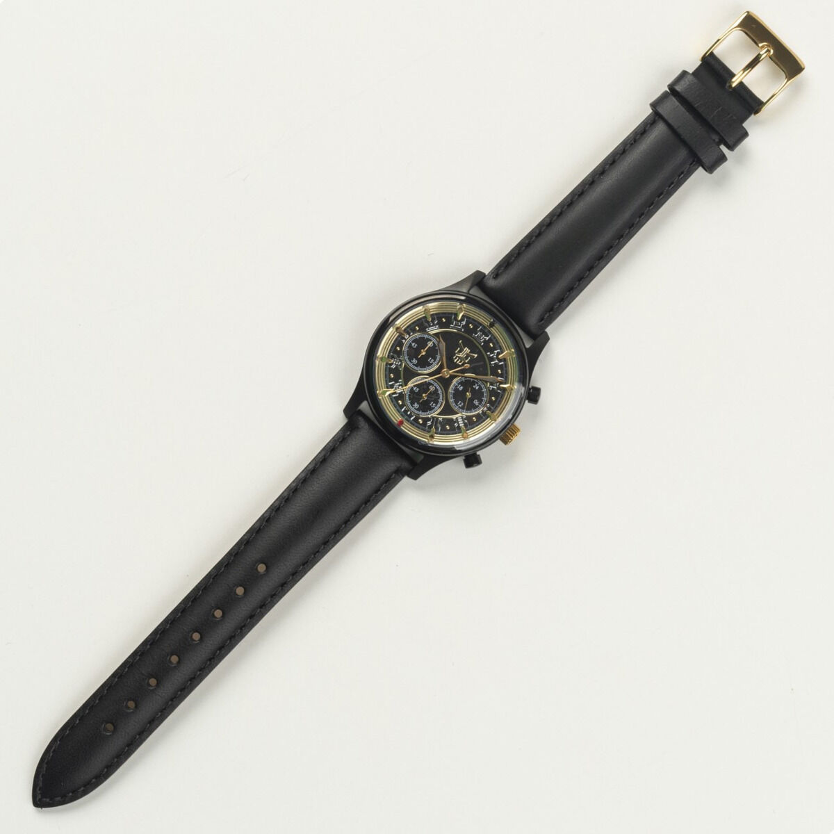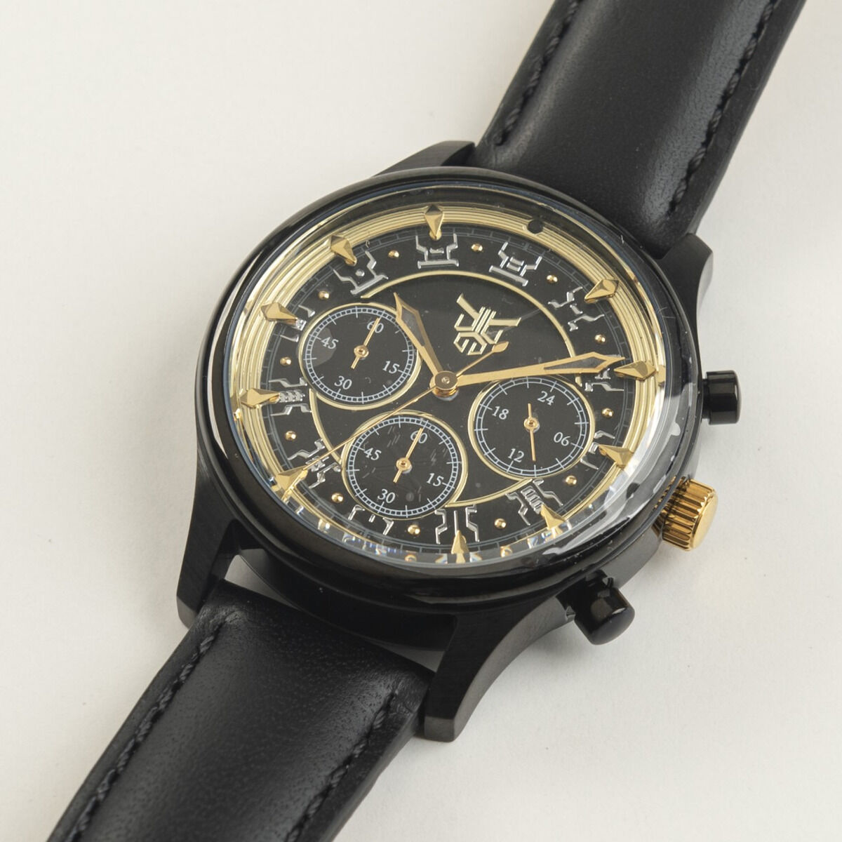 整體設計以黑底搭配金色裝飾,完美重現「究極形態」那種霸氣又神秘的氛圍。立體的金色細節增添一股高級質感。錶面上的數字部分,特別用了劇中的超古代文字「臨多文字」來呈現,整個很有世界觀的沉浸感。