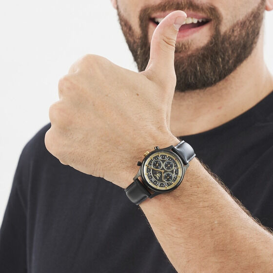 12 點鐘位置鑲有一顆黑色寶石,象徵空我的深沉力量;6 點鐘則嵌有一顆紅色寶石,靈感來自空我變身後那雙紅眼。秒錶的盤面(6 點方向)還刻有象徵「時間」的臨多文字,非常細膩。