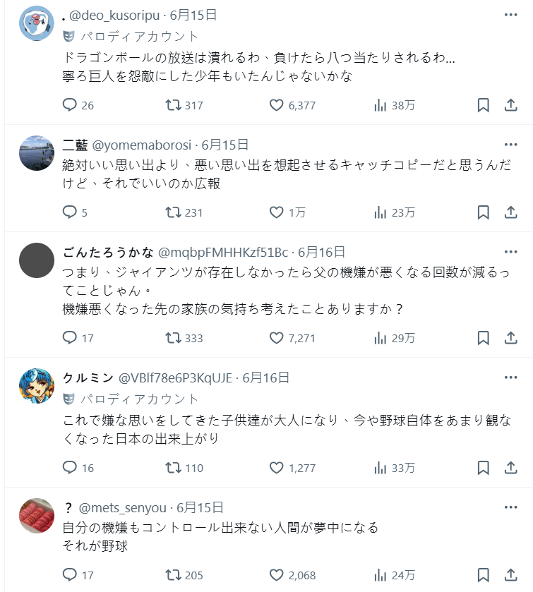 亦有網友貼出嘲諷的改圖,認為球團強調跟父親看球的回憶是沒問題的,但如果用「爸爸今天心情好不好,全看巨人隊表現」,這大家可能沒有什麼好回憶,畢竟大家鐵定想到輸球老爸氣得要死的模樣。