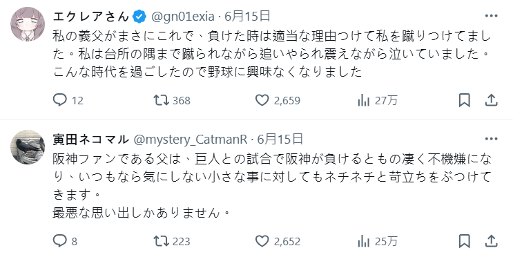 當然也不只限定讀賣巨人,不少網友都表示喜歡棒球的老爸,常常都會因為支持的球隊表現左右他的心情,甚至還會因此對家人發脾氣,實在很難有什麼美好的回憶。