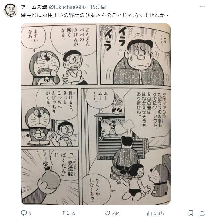 《哆啦A夢》漫畫中也有這樣的場面,平常看起來和藹的大雄爸爸,看球賽也是會看到心情暴躁,當然比賽中也是巨人隊 XD。