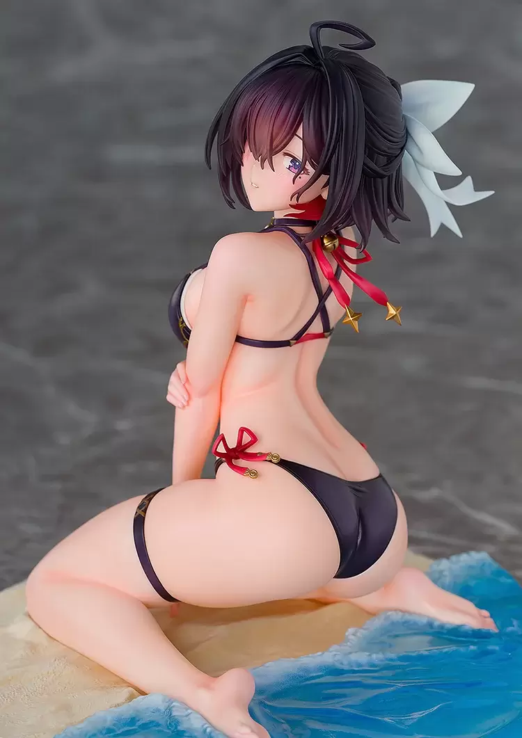 「優米雅·利斯菲爾德 泳裝Ver. 1/7比例模型」,以遊戲角色設計 Benitama(べにたま)特別繪製的特典插畫為基礎,將性感的泳裝造型立體化~尺寸約高 21 公分,優米雅淡淡的表情搭配大膽的比基尼泳裝形成反差感,撩人的跪坐姿勢在波浪拍打在沙灘的台座上,肉感的大腿與豐滿的上圍,散發無限魅力!頭髮採用透明材質製作,呈現擁有透明感的黑髮細節,髮絲與緞帶隨著海風飄動,充滿盛夏氣息~