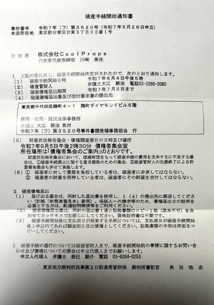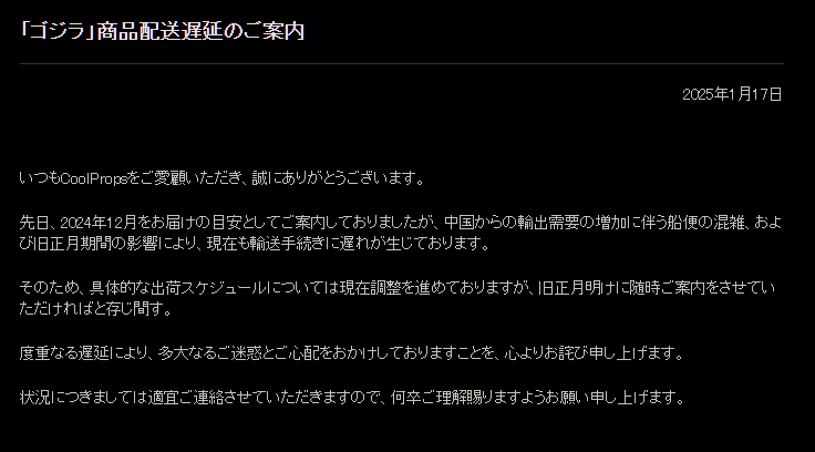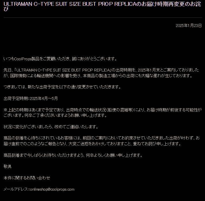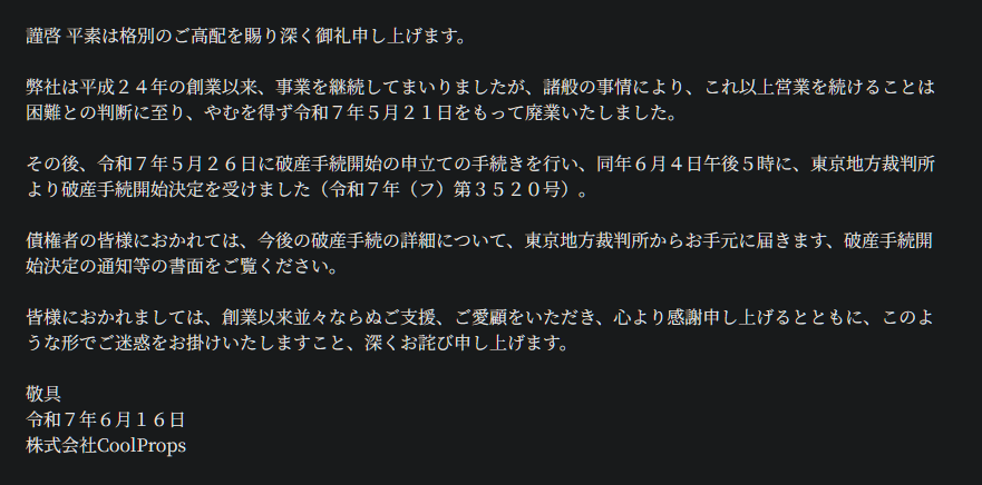 日本知名的特攝角色雕像、影視道具複製品製造商 CoolProps 宣佈,公司已於 2025 年 05 月 21 日歇業、同月 26 日聲請破產手續,並在同年 06 月 04 日由東京地方法院裁定宣告破產,負債總額高達 1 億 4000 萬日圓。數款發售延期多年的雕像商品確定無庫存出貨,即便 CoolProps 委託的製造工廠有庫存,也因支付不出款項而無法完成交貨。