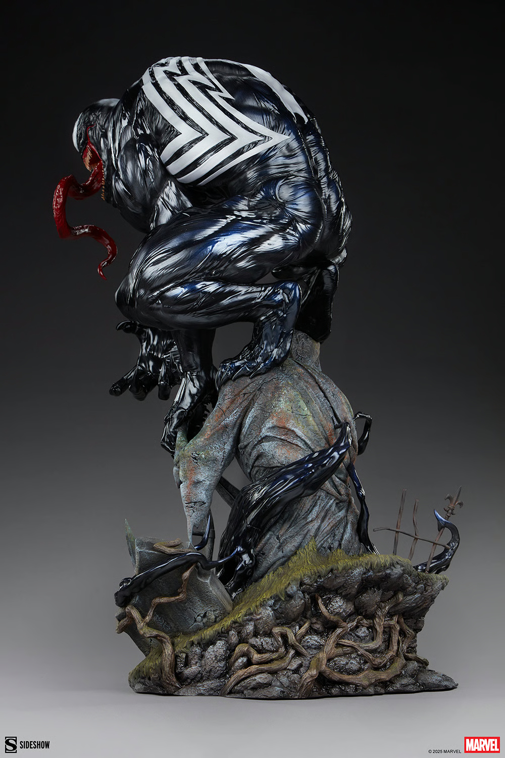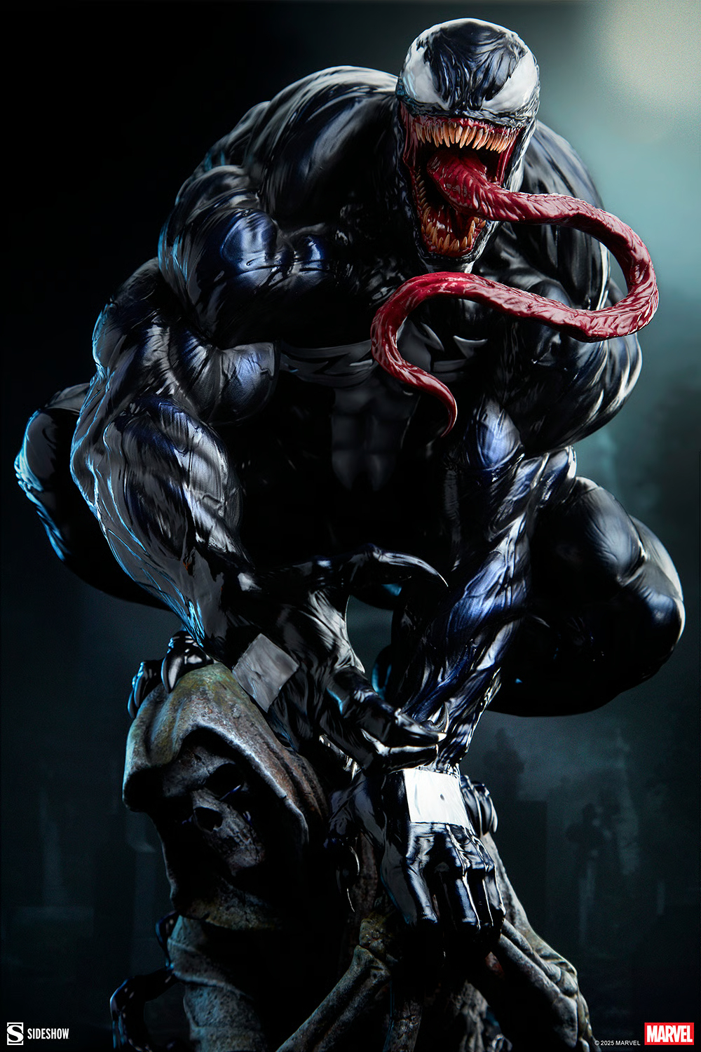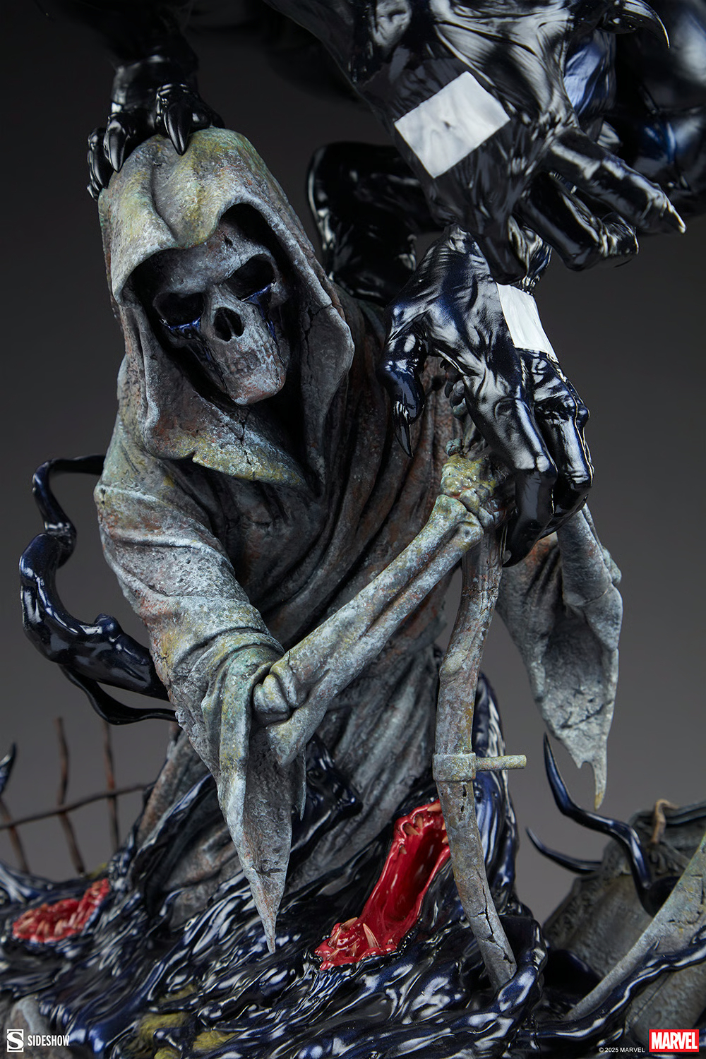 本作高約 59 公分,展現出猛毒盤踞在一座持握鐮刀的死神石像之上,壯碩的軀體、狂暴的雙眼與舌頭、尖銳的利爪,以及蔓延至草地的漆黑共生體,帶來強烈的威壓氣息與死亡威脅。從頭雕、肌肉線條的刻畫,到利齒張揚的巨口都呈現出細膩造型力,搭配共生體極具生物感的光亮色澤,相當精彩。