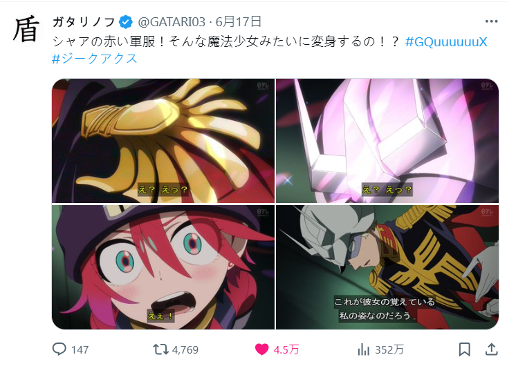 這段落被許多觀眾揶揄根本是魔法少女變身橋段,從來沒想到夏亞居然可以在鋼彈作品中有這樣的表現,讓不少粉絲大為驚豔。