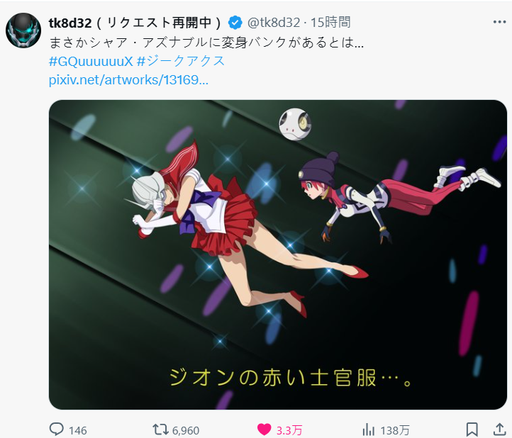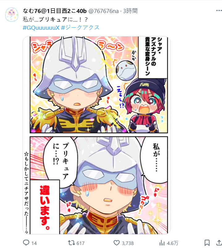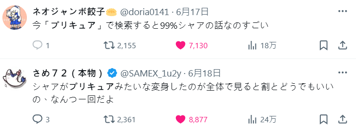 像這類二創也不少,現在在 X 搜尋夏亞的關鍵字反倒出現很多光之美少女或是魔法少女的關聯搜尋。