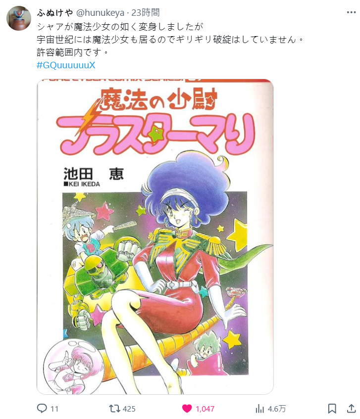 不過也有網友表示,過去漫畫家池田惠的漫畫《魔法の少尉ブラスターマリ》就很類似這樣的風格,當然是穿上像是夏亞的服裝,但非夏亞本人就是了 www。