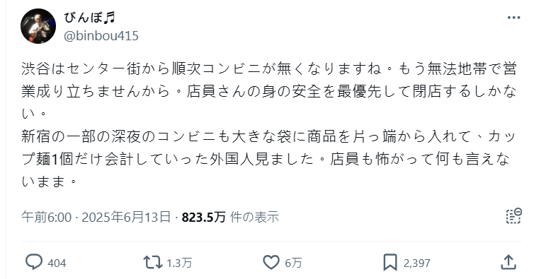 引起討論的推主發文表示:「澀谷的便利商店從センター街(中心街)開始,一間一間收掉了,因為已經成為無法地帶,正常營業根本行不通,只能優先保護店員的安全而選擇停業。」他指出,自己在新宿某便利商店目擊外籍人士把大包小包的商品掃進袋子裡,卻只結帳一碗泡麵,店員因為害怕什麼都不敢說。