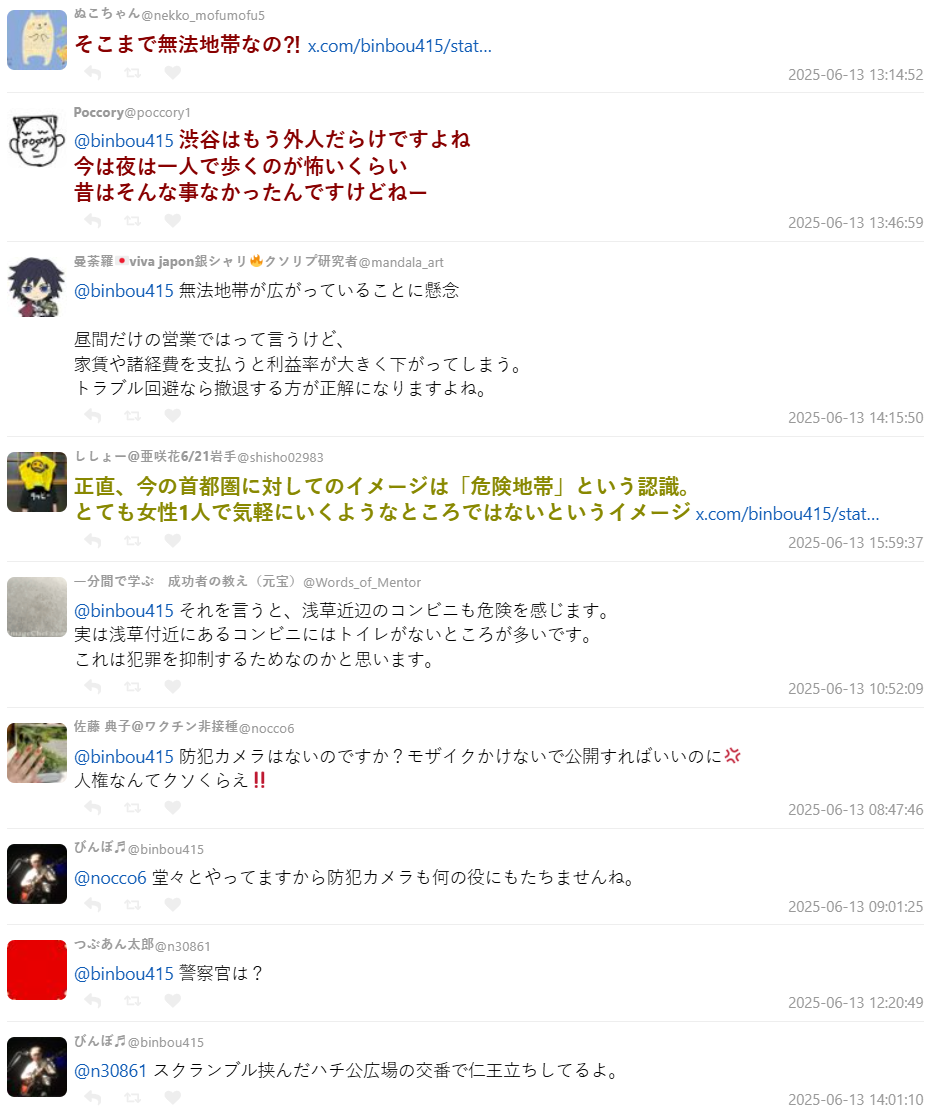 該則貼文引起大量網友共鳴與回應:「晚上根本不敢一個人走路」、「現在的澀谷根本是外國人一霸,晚上走在路上超可怕,跟以前完全不同。」、「現在對首都圈的印象就是‘危險地帶’,根本不適合女生一個人出門。」、「乾脆取消便利商店24小時營業,像唐吉軻德那種也應該晚上九點就打烊。」、「警察人呢?」。